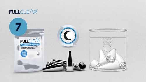 Once clean place nozzles / sparklers in a glass, add 1 Nozzle Cleaning Tablet, fill with clean cold water and leave overnight.